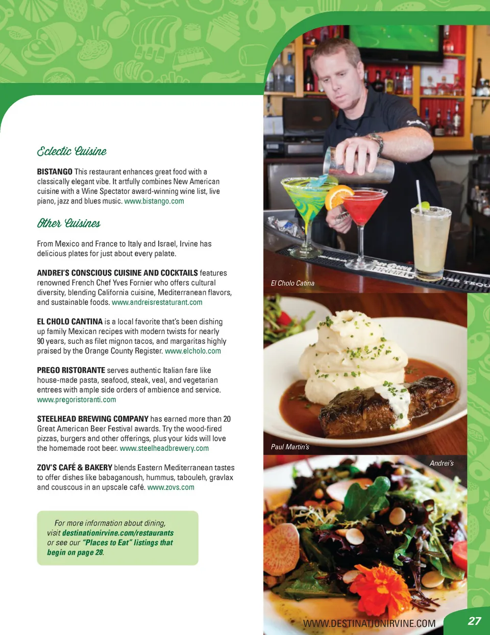 International DINING 85ºC Bakery Café Gatten Sushi IRVINE OFFERS YOU A WORLD OF UNIQUE DINING CHOICES, FROM THE PACIFIC RIM AND LATIN AMERICA TO EUROPEAN AND GOOD OLD-FASHIONED AMERICAN COMFORT FOOD. For a romantic date, family dining, business meetings, a great steakhouse, or even cuisine with international flair, Irvine has an extraordinarily diverse menu of dining choices, all within a few miles of your hotel or home. Asian Cuisine Nearly 40% of Irvine’s population is Asian, attracting a great many family members and business travelers each year. While Koreans, Chinese and Japanese love their individual signature Asian cuisine, within Southern California you can only enjoy some of their delicacies right here in Irvine. Classic American Cuisine and Steakhouses Whether you love bistro classics or meat, Irvine offers a prime variety of dining establishments, including: AGORA CHURRASCARIA is a Brazilian steakhouse serving up to 16 cuts of grilled meats by gaucho-clad waiters. The picanha is their most tender sirloin. www.agorachurrascaria.com PAUL MARTIN’S AMERICAN GRILL embodies the “Local, Seasonal, Delicious.” mantra for a back-to-the-farm American Grill. www.paulmartinsamericangrill.com RUTH’S CHRIS is the penultimate restaurant for USDA Prime steaks and fresh seafood. www.ruthchris.com Diamond Jamboree www.diamond-jamboree.com This unique, vibrant and bustling retail center features over 20 dining destinations to please every palate, including Korean, Chinese, Japanese, Thai, Vietnamese, Greek, French and American. 85ºC BAKERY CAFÉ offers Chinese sweet treats at one of only two U.S. locations for this famous Taiwan venue. AJISEN RAMEN has noodle dishes, curries and tonkatsu. BCD TOFU HOUSE is famous for bowls of sizzling hot Korean soup. SWSH SHABU SHABU presents sukiyaki, saké and more. Coffee Paradise Perks Espresso & Tea Bar is an independently owned and run local favorite that’s unlike any place in Irvine or Orange County. www.paradiseperks.com 26 2013-2014 IRVINE VISITORS GUIDE