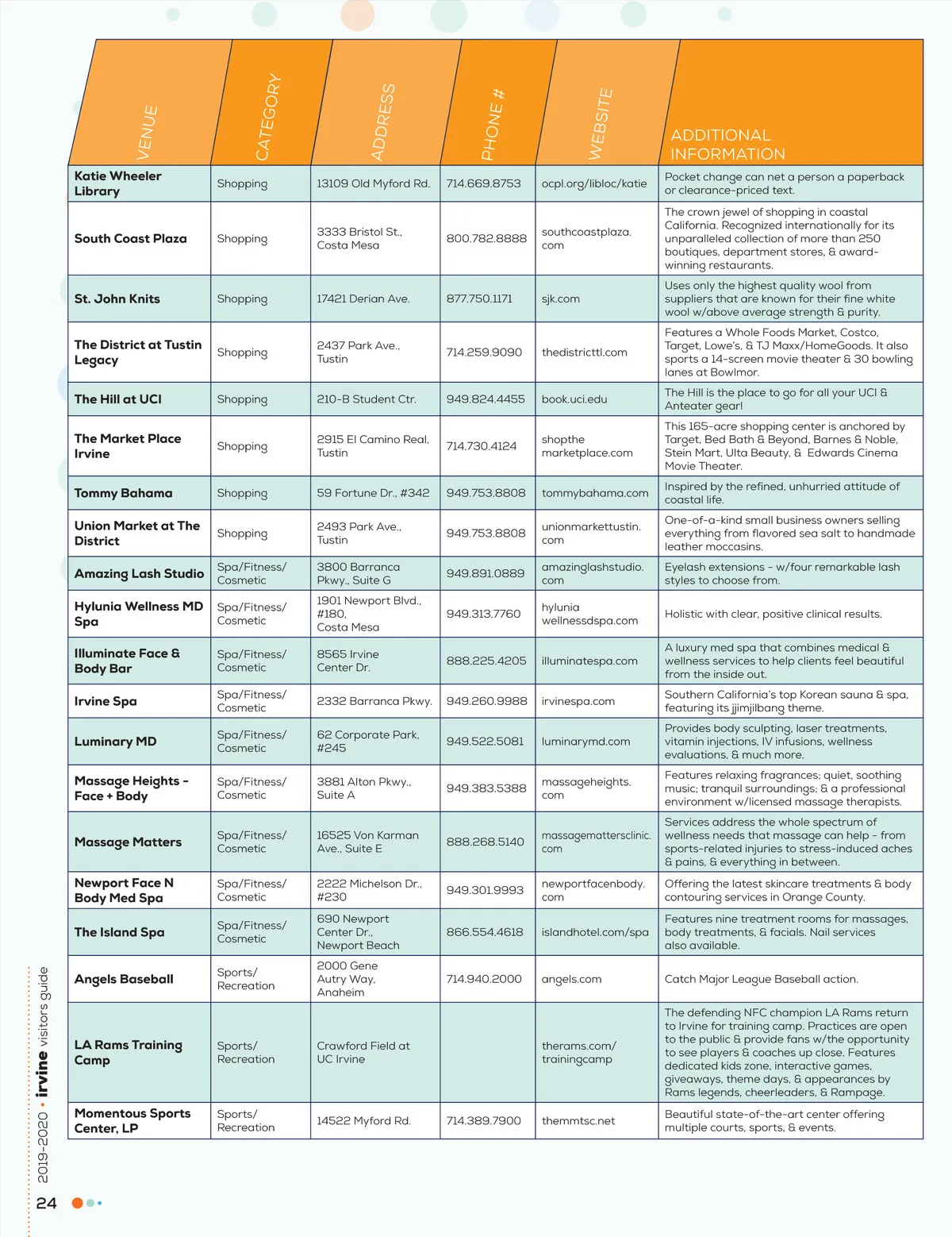 CATEGOR Y SS VENUE PHONE WEBSITE ADDRE # ADDITIONAL INFORMATION Pocket change can net a person a paperback or clearance-priced text. The crown jewel of shopping in coastal California. Recognized internationally for its unparalleled collection of more than 250 boutiques, department stores, & award-winning restaurants. Uses only the highest quality wool from suppliers that are known for their fine white wool w/above average strength & purity. Features a Whole Foods Market, Costco, Target, Lowe’s, & TJ Maxx/HomeGoods. It also sports a 14-screen movie theater & 30 bowling lanes at Bowlmor. The Hill is the place to go for all your UCI & Anteater gear! This 165-acre shopping center is anchored by Target, Bed Bath & Beyond, Barnes & Noble, Stein Mart, Ulta Beauty, & Edwards Cinema Movie Theater. Inspired by the refined, unhurried attitude of coastal life. One-of-a-kind small business owners selling everything from flavored sea salt to handmade leather moccasins. Eyelash extensions -w/four remarkable lash styles to choose from. Holistic with clear, positive clinical results. A luxury med spa that combines medical & wellness services to help clients feel beautiful from the inside out. Southern California’s top Korean sauna & spa, featuring its jjimjilbang theme. Provides body sculpting, laser treatments, vitamin injections, IV infusions, wellness evaluations, & much more. Features relaxing fragrances; quiet, soothing music; tranquil surroundings; & a professional environment w/licensed massage therapists. Services address the whole spectrum of wellness needs that massage can help -from sports-related injuries to stress-induced aches & pains, & everything in between. Offering the latest skincare treatments & body contouring services in Orange County. Features nine treatment rooms for massages, body treatments, & facials. Nail services also available. Catch Major League Baseball action. The defending NFC champion LA Rams return to Irvine for training camp. Practices are open to the public & provide fans w/the opportunity to see players & coaches up close. Features dedicated kids zone, interactive games, giveaways, theme days, & appearances by Rams legends, cheerleaders, & Rampage. Beautiful state-of-the-art center offering multiple courts, sports, & events. Katie Wheeler Library Shopping 13109 Old Myford Rd. 714.669.8753 ocpl.org/libloc/katie South Coast Plaza Shopping 3333 Bristol St., Costa Mesa 800.782.8888 southcoastplaza. com St. John Knits Shopping 17421 Derian Ave. 877.750.1171 sjk.com The District at Tustin Legacy The Hill at UCI The Market Place Irvine Tommy Bahama Union Market at The District Amazing Lash Studio Hylunia Wellness MD Spa Illuminate Face & Body Bar Irvine Spa Luminary MD Massage Heights -Face + Body Shopping 2437 Park Ave., Tustin 210-B Student Ctr. 2915 El Camino Real, Tustin 59 Fortune Dr., #342 2493 Park Ave., Tustin 3800 Barranca Pkwy., Suite G 1901 Newport Blvd., #180, Costa Mesa 8565 Irvine Center Dr. 2332 Barranca Pkwy. 62 Corporate Park, #245 3881 Alton Pkwy., Suite A 16525 Von Karman Ave., Suite E 2222 Michelson Dr., #230 690 Newport Center Dr., Newport Beach 2000 Gene Autry Way, Anaheim 714.259.9090 thedistricttl.com Shopping 949.824.4455 book.uci.edu shopthe marketplace.com tommybahama.com unionmarkettustin. com amazinglashstudio. com hylunia wellnessdspa.com illuminatespa.com irvinespa.com luminarymd.com massageheights. com massagemattersclinic. com newportfacenbody. com islandhotel.com/spa Shopping 714.730.4124 Shopping Shopping Spa/Fitness/ Cosmetic Spa/Fitness/ Cosmetic Spa/Fitness/ Cosmetic Spa/Fitness/ Cosmetic Spa/Fitness/ Cosmetic Spa/Fitness/ Cosmetic Spa/Fitness/ Cosmetic Spa/Fitness/ Cosmetic Spa/Fitness/ Cosmetic Sports/ Recreation 949.753.8808 949.753.8808 949.891.0889 949.313.7760 888.225.4205 949.260.9988 949.522.5081 949.383.5388 Massage Matters Newport Face N Body Med Spa The Island Spa 888.268.5140 949.301.9993 866.554.4618 • irvine visitors guide Angels Baseball 714.940.2000 angels.com LA Rams Training Camp Sports/ Recreation Crawford Field at UC Irvine therams.com/ trainingcamp 2019-2020 Momentous Sports Center, LP Sports/ Recreation 14522 Myford Rd. 714.389.7900 themmtsc.net 24